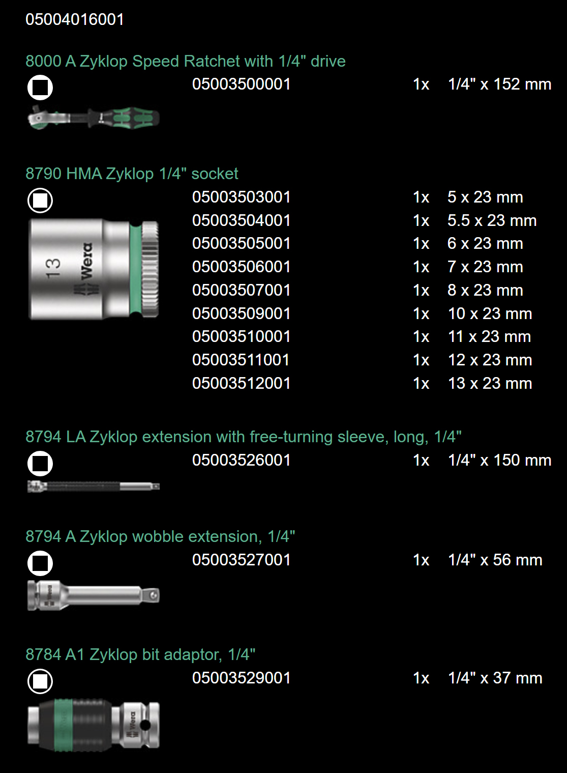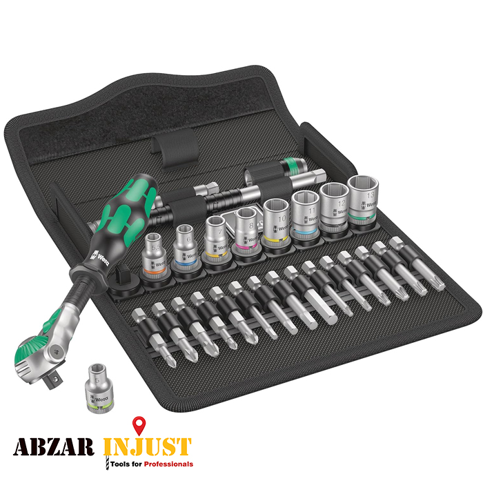 ست 28 عددی زایکلوپ از برند Wera یکی از خاصترین ستهای این برند هست. درایور آچار زایکلوپ این ست 1/4 هست و سایز سوکتهای بکس هم متریک هست که استفاده از این ست در ایران رو بسیار راحت میکنه. در عکس زیر جزییات اقلام این ست رو مشاهده میکنید: